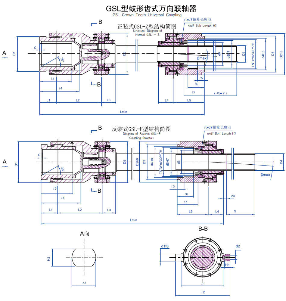 2.Lmin为联轴器允许制造的最短长度尺寸,实际工作需要的最短长度以及伸缩量可根据实际需要确定,但必须≧Lmin